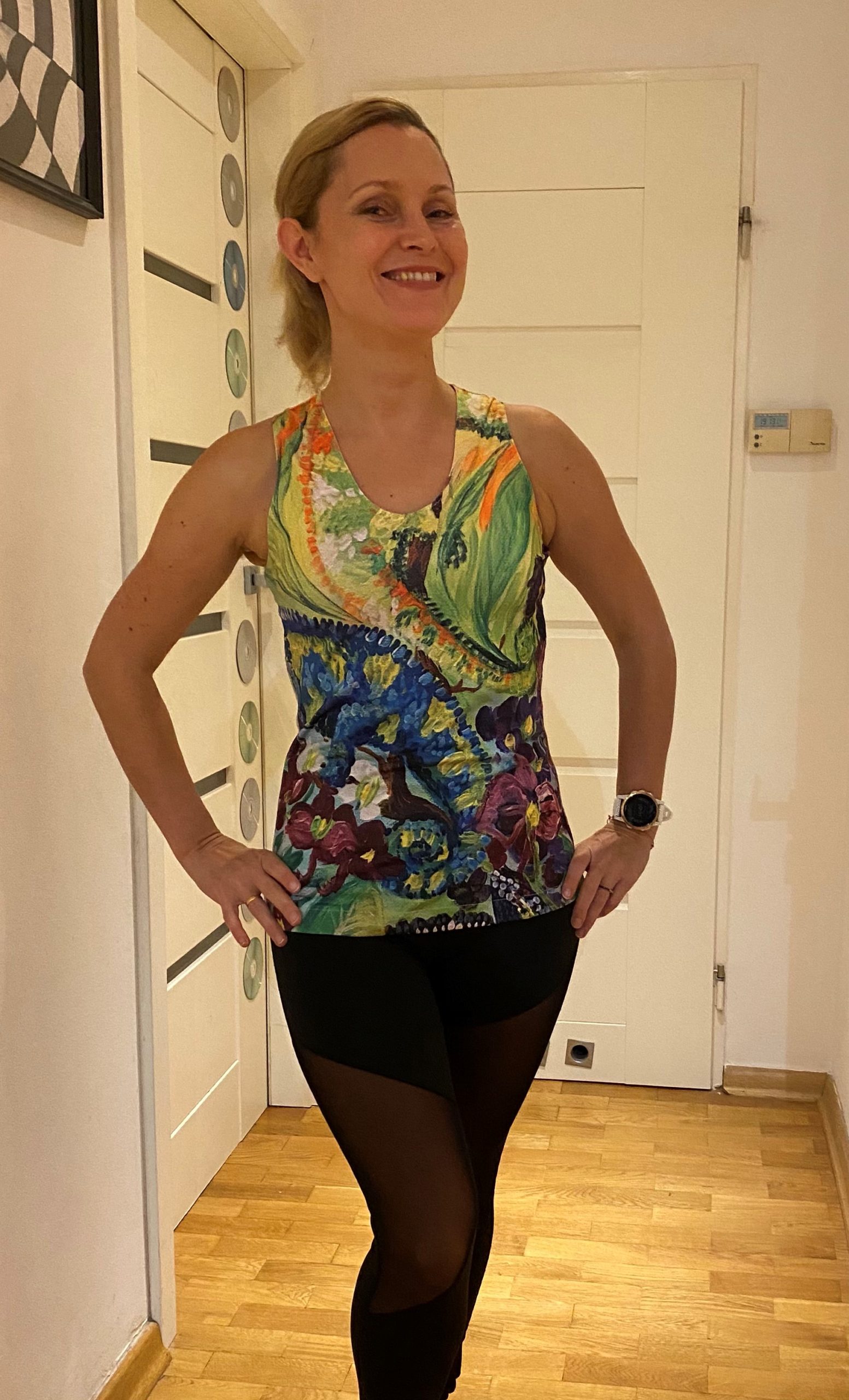 Koszulka biegowa z super przyjaznego, przyjemnego w dotyku materiału sportowego najlepszej jakości. Materiał jest oddychający, nieprzemakalny, przeciwwietrzny a jednocześnie fantastycznie trzymający w ryzach nasze ciało i kształtujący je bardzo kobieco. Koszulka ma prosty a zarazem kobiecy kształt. Można ją stosować do biegania ale równie dobrze nadaje się do czarnych dżinsów 🙂 Materiał jest z tych cieplejszych jesienno-zimowych. Skład i gramatura: 300g/m2, 16 % EL, 84 % PES