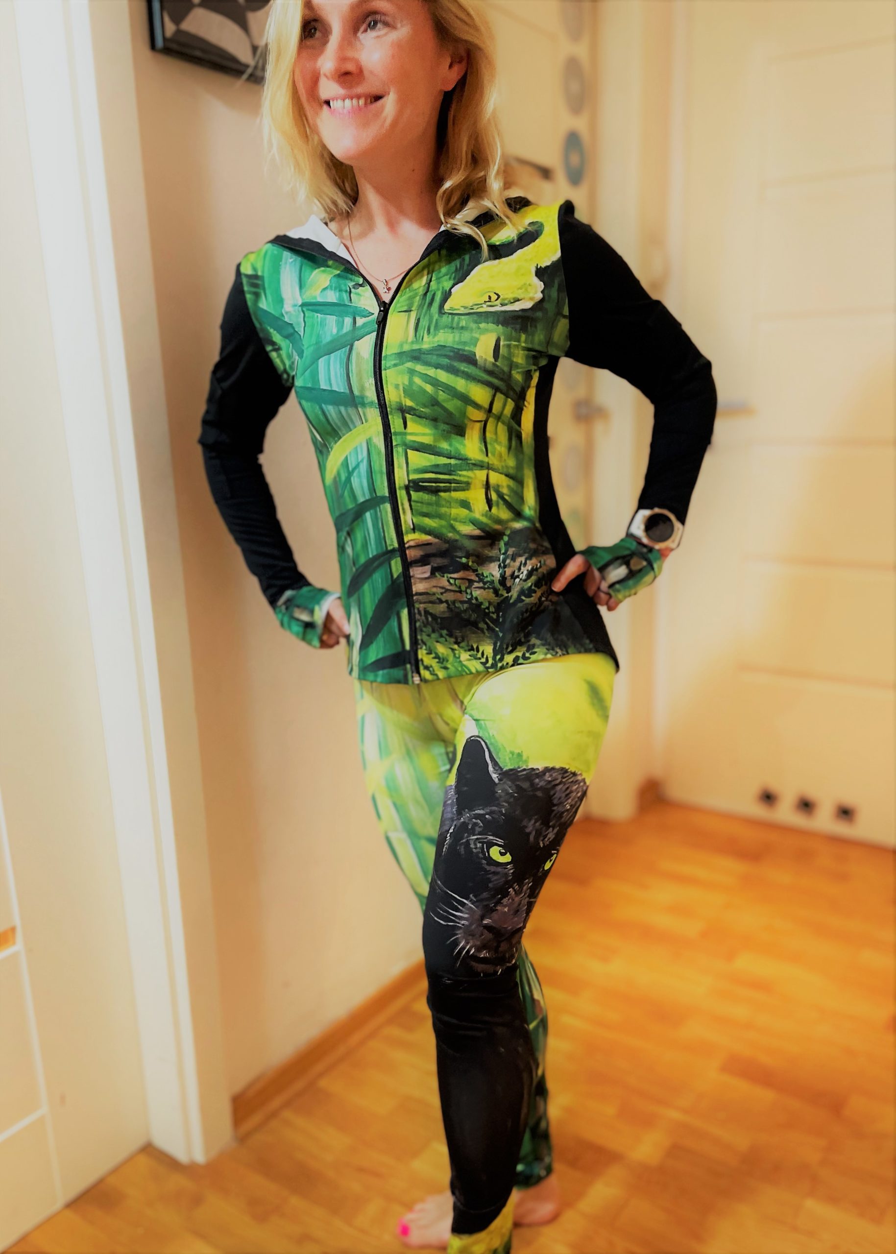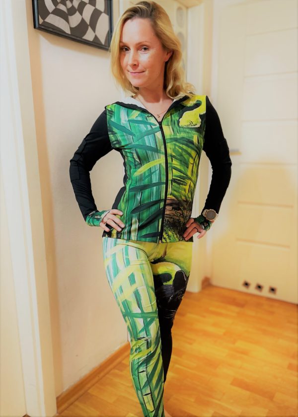 Legginsy z kolekcji ,,Czarna Pantera” to prawdziwy HIT ! Są to spodenki wyszczuplające (dzięki kolorystyce i podłużnym pasom bambusów) i nadające nam prawdziwie kobiece i zmysłowe kształty a jednocześnie to legginsy z prawdziwym pazurem 🙂 Materiał jest bardzo dobrej jakości, sportowy, lekki wiosenno-letni, oddychający, szybkoschnący i przewiewny. Legginsy są wykończone w talii szerokim czarnym pasem podkreślającym naszą talię osy 🙂 W pasie wszyta jest tylna kieszeń, pojemna mieszcząca doskonale telefon. Kolekcja ,,Czarna Pantera” śmiało nadaje się również na wieczorne i nocne wybiegania, bo nie dość że kociak chroni nas przed zaczepkami i odstrasza skutecznie, dodaje nam siły do biegu to jeszcze w tych odblaskowych kolorach zieleni jesteśmy świetnie widoczni na ulicach !